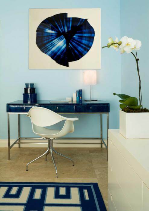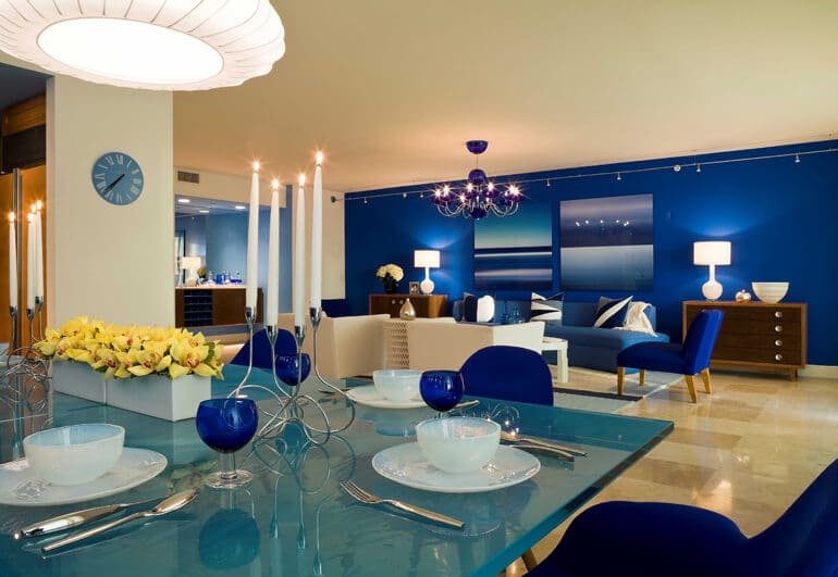 This stylish apartment in Miami, Florida, is a perfect warm weather retreat for a couple from the Northeast during winter season. Almost none of the New York- based firm IKBA’s houses look alike. This contemporary apartment stands out due to its bold contrast between dazzling whites and saturated blues shades displayed in an unique manner. An open space living room with a balcony that offers magnificent views of azure water and Florida sky set the tone. Characterized by subtle sophistication yet simplicity, the apartment is tastefully-decorated displaying an interesting mix of modern furniture design with texture and clean lines, and charming combination of colors and patterns that create a feeling of calmness and space. Comfortable sofa, warm lightning, flower arrangements give a romantic feel to the apartment. A table with blue transparent glass and comfortable chairs is an open invite to guests. The pendant lamp is very original and worth studying from a close angle. Enjoy the details offered by this interesting apartment and let us know what’s your opinion about it.