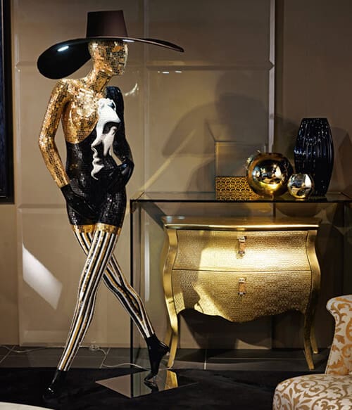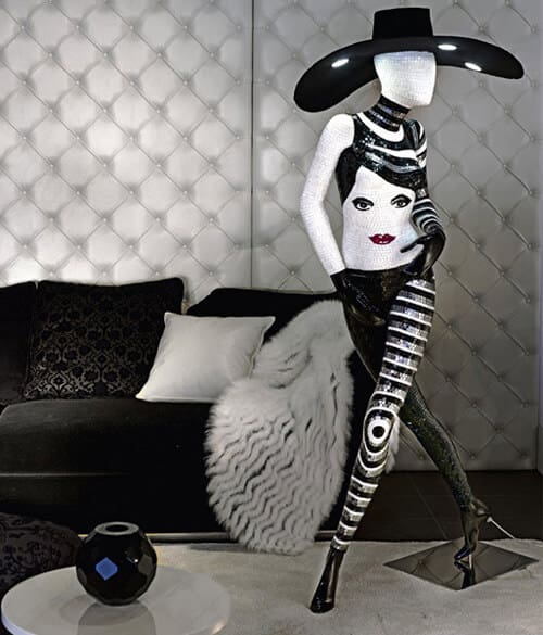 In this fantastic design’s type you can see that the functionality is part of a complex design idea, reflected by a dynamic figure of a mysterious woman, dressed in a daring dress and wide-brimmed enormous hat, which integrates lighting. It’s eccentric design captures the potential of a fascinating and versatile material. Using shiny mosaic tiles instead of various metals allows the artist to create a gorgeous sparkling lamp sculpture with glamourous design that resembles to models on fashion catwalks.