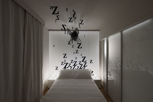 Every room have a particular theme which is both original and luxurious: from enchanted forest with owls as lamps, candies (pillow-shaped fruit tarts and candy chandelier decorated with porcelain biscuit), golden hearts and fluffy white clouds or a bed of roses, to the classic fairy characters. Rooms translate almost all fantasies and ideals on which any client or Moschino model would have had in childhood with its surrealist accents like a huge ballgown that bracket the whole bed and the wall, heels and kettles, a bridge with shelves full of boxes of toys. But room decor is not only detached from the story. Sheep, bright clouds and armchairs in the lobby are covered with white cloth, translucent, this the decor is complemented by Moschino white dresses as a floor lamps. If we want to refer to colors, shades of white and beige are ever-present in the hotel public spaces which are complemented by large areas of glass and mirror, in which many lamps and light objects reflect.