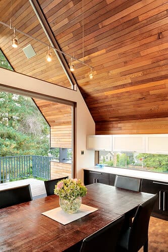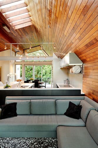 Designed in 1966 by prominent Northwest architect Paul Hayden Kirk, 2430 sqf Queen Anne Mid-Century house has been extended and reordered in order to get a modern update, but keeping the original integrity at the same time. Without knowing the fact that the the Northwest contemporary house was a creation of a well-known architect, the owners have bought it years ago because they love the sense of serenity and peaceful calm that the house transmitted and later they wanted to find a good architect to reconfigure the space. Lane Williams of Coop 15 Architecture accepted the challenge of redesign the house, a process that wasn’t very difficult for him, although he should retain a lot of the original design while create more space and improve the rooms’ aesthetic that will provide a warm feeling. The big idea behind the original design was that the house was a compact composition with a roof that merged with its north- and south-side walls as a single, folded plane. By using cedar shingles on the exterior roof and siding and cedar paneling on its interior, it was created continuity. With very limited space for family activities, the architect pushed the footprint about 10 feet to the west, increasing the kitchen size on the upper level from 80 to 130 square feet and adding a new dining area (the old one was converted to a family room).