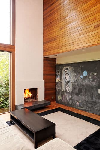 He reconfigured the entry from the carport to add a mudroom and powder room, and opened up the stairway to the lower level. To lighten things up, he added white-painted drywall to the cedar paneling along the interior partition walls, added more windows and slide-fold glass doors to the west end of the house, and refaced the original brick fireplace with off-white Milestone, a mix of cement and acrylic. On the lower level, the large space was reconfigured to create a more defined living area, a bedroom for each child, and a new children’s bathroom; the original lower-level bedroom is now a flexible media room that can be closed off with huge chalkboard-covered sliding doors to become a guest suite. To complete the new look, they added modern furniture, new appliances, all in a black and white theme which contrasts very well with the warmth of the wood.