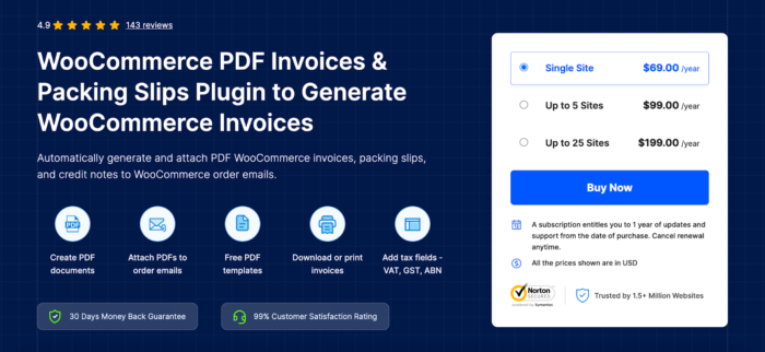 The automation features are a huge time-saver, especially for stores with high order volumes. It also supports multiple languages and currencies, making it ideal for global businesses. There’s a free version of the WooCommerce Invoice and Packing slips plugin that can be accessed by all WooCommerce users.